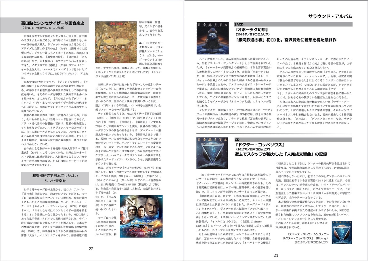 作編曲家・冨田勲のオールカラーディスコグラフィー(46ページ)。筆者が執筆した、現在入手困難な冨田勲×初音ミク『ドクター・コッペリウス』公式プログラムの巻末パートに、追記原稿を加えた少部数のインディーズ出版ヴァージョン。機材に関するコラム、珍しいジャケット写真など満載。